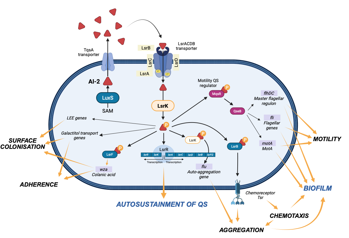 Bacterial quorum sensing represents a key regulatory system that enables microbial populations to coordinate collective behaviours in response to cell density. Among the different quorum sensing pathways, the autoinducer-2 (AI-2) system is particularly relevant due to its role as a universal interspecies signaling mechanism.